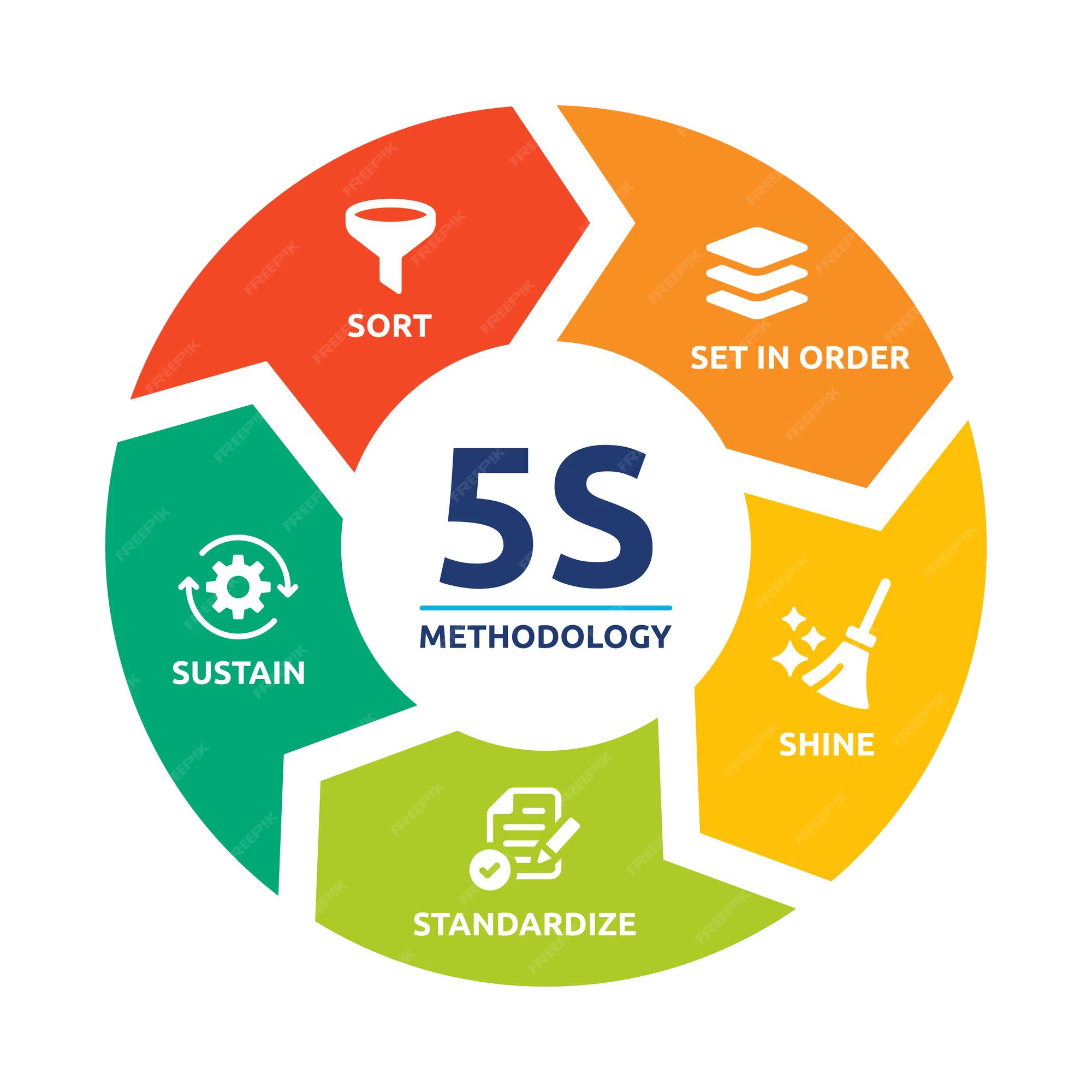 Menetelmä perustuu viiteen japanilaiseen sanaan – Seiri, Seiton, Seisō, Seiketsu ja Shitsuke – jotka suomeksi yleensä käännetään: