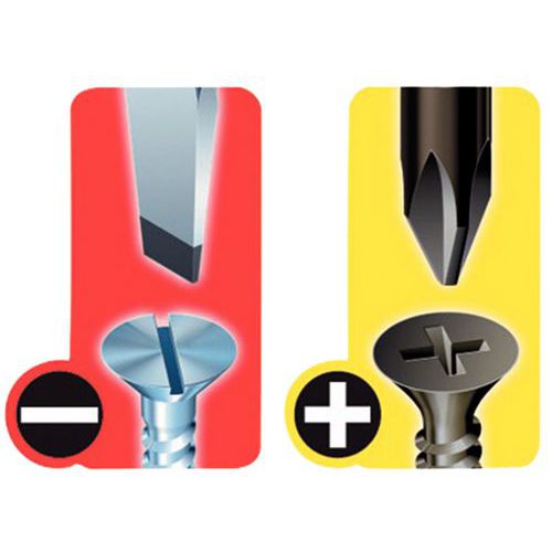 - Värikoodaus ja kaaviokuva auttavat tunnistamaan ruuvimeisselin välittömästi.