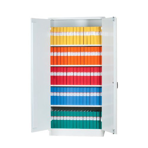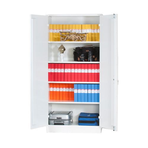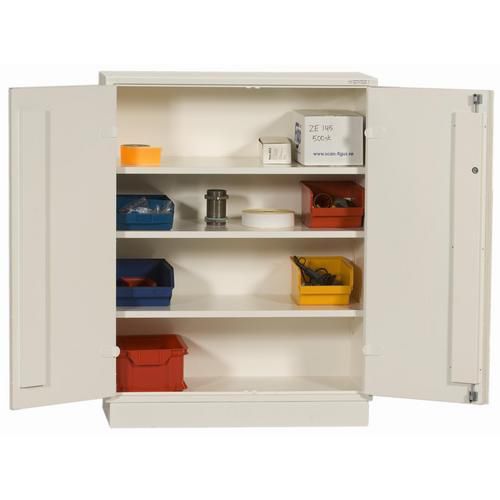 Kaapin etusivu, pohja, päällyslevy ja sivuseinät kaksinkertaista teräslevyä, joiden välissä on paloeristys (Euroclass A1). Suosittelemme eristystä myös takalevyyn, jos kaappi sijoitetaan vapaasti seisovaksi. Vahvasti tuettut saranat. Kahvassa varohaka. Pitkäsalpa ja Assa-sylinterilukko. Käyttökohteet: Kirjanpito, instrumentit, AV-laitteet, konttoritarvikkeet jne. Täyshitsatt.