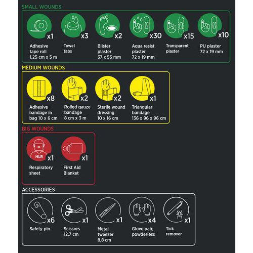 | Tavaranimike | Ensiapulaukku, Vedenkestävä, Väri: Musta, Leveys: 135 mm, Pituudet: 220 mm, Syvyys: 90 mm |