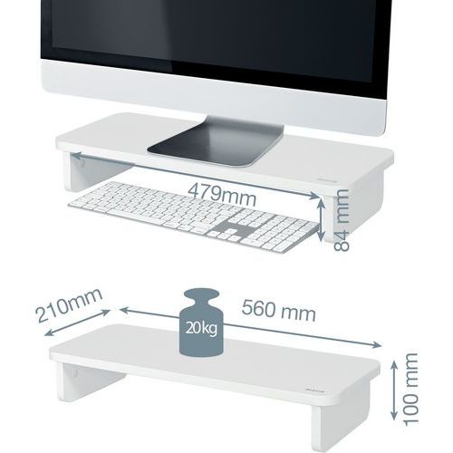 | Tavaranimike | Ergo näyttöteline, Maks kuormitus: 20 kg, Väri: Valkoinen, Kokonaiskorkeus: 80 mm, Kokonaisleveys: 560 mm |