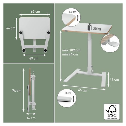 65 x 46 x 1,8 cm kokoinen pöytälevy tarjoaa tilaa kannettavalle tietokoneelle telineineen, näppäimistölle ja hiirelle ja kestää jopa 20 kg kuorman.