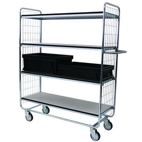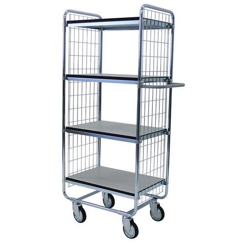 - Hyllyjen enimmäiskuormitus 100 kg. Neljä kääntöpyörää 125 x 32 mm, ESD-hyväksytty kuulalaakerinapa ja lankasuojus.