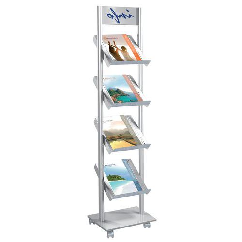 Siirrettävä. Vakaa esiteteline pyörillä. Valmistettu alumiininharmaasta metallista. Vastuullinen tuote Kestävän kehityksen standardit - Senter Novem Takuu (vuosia) : 3 vuotta