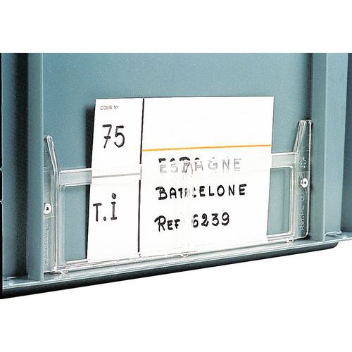 | Tavaranimike | Etikettipidike – Niitattava, Laatikkotyypille: Pinottavat laatikot, Väri: Läpinäkyvä |