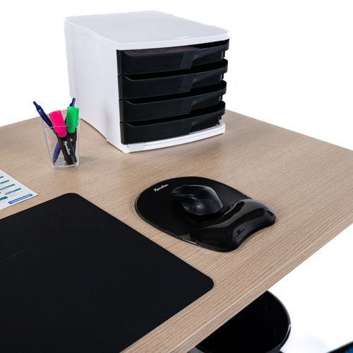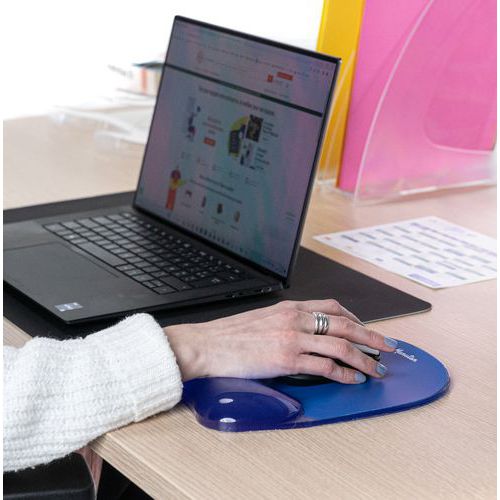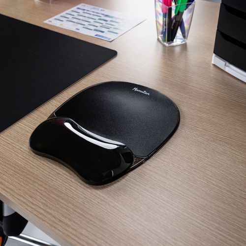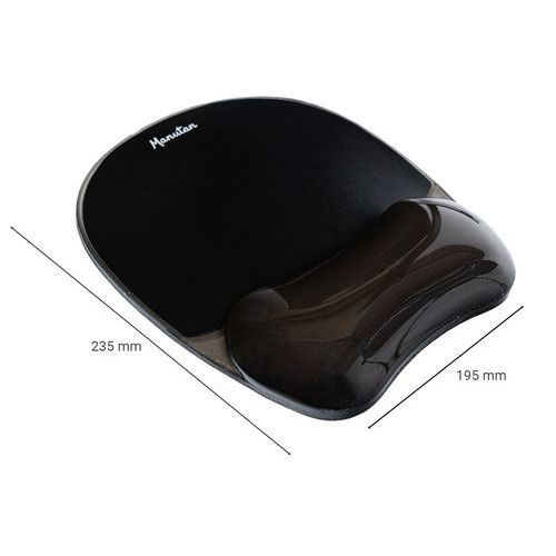 Ergonomisesti muotoiltu hiirimatto. Rannetuki on valmistettu geelistä, joka antaa tukea ja vähentää rasitusta. Matossa on suuri pinta-ala ja se on valmistettu polyuretaanista ja geelistä.