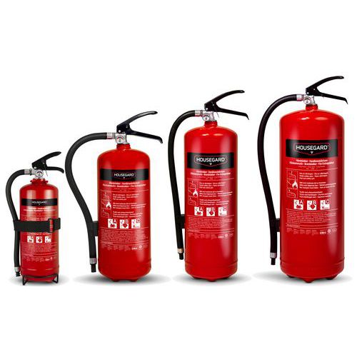 - Punainen jauhesammutin, jota käytetään kiinteiden materiaalien, nesteiden ja kaasujen sammuttamiseen (luokat A, B ja C).