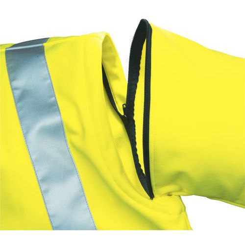 Säätö kiristysnauhalla ja lukolla. Heijastinnauha 3M™ Scotchlite™. Suora kaksinkertainen kaulus.
