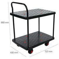 Vankka ja monikäyttöinen kärry. Kärry vahvistetuilla hyllyillä. Erittäin helppo liikutella kahden kääntyvän ja kahden kiinteän pyörän ansiosta. Pystysuora työntökahva.