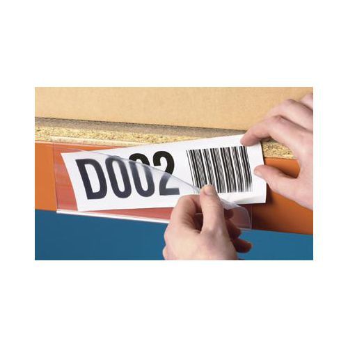 Helppo vaihtaa: taita vain etureuna ja aseta lappu paikalleen. Suojattu pölyltä. Viivakoodit voidaan lukea muovin lävitse. Mukana valkoiset etiketit.