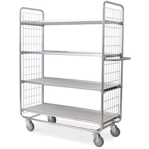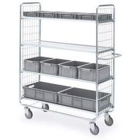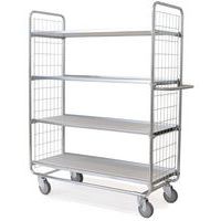 Ruotsalaisvalmisteiset hyllyvaunut, joissa on kirkasgalvanoitu teräsrunko – täydellinen valinta keräilyyn ja kuljetukseen myymälöissä, toimistoissa tai varasto- ja logistiikkaympäristöissä.