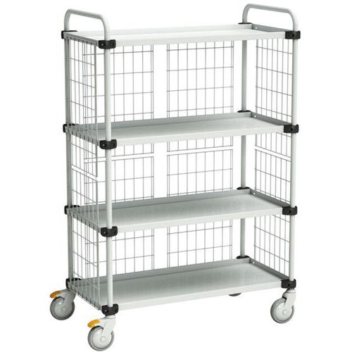 Vakaa ja helposti liikuteltava vaunu työkalujen tai komponenttien väliaikaiseen varastointiin ja kuljetukseen erilaisissa ympäristöissä. Erittäin monipuolinen kärry vakaalla teräsrungolla ja korkeussäädettävillä hyllyillä. Vaunussa yhdistyvät ergonominen toiminta ja tyylikäs muotoilu. Lisävarusteina ovat mm. teräsritilälevyt. Pyöreät, jauhemaalatut (vaaleanharmaa, RAL 7035) teräsputket (halkaisija 25 mm) päätykehyksissä Pulverimaalatut teräshyllyt korkeussäädöllä, 2 tai 4 hyllyä vakioratkaisussa Neljä kääntyvää pyörää (halkaisija 125 mm), kaksi joista jarrut Lisähyllyt, teräsritiläpaneelit, hyllynjakajat asiakirjateline saatavana lisävarusteena Max kuorma 150 kg/300 kg Saatavana myös ESD-suojalla. Lastauskorkeus: 295 / 65 / 925 mm
