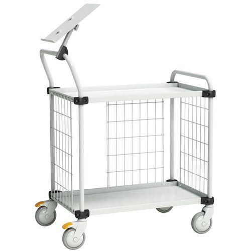 Vakaa ja helposti liikuteltava vaunu työkalujen tai komponenttien väliaikaiseen varastointiin ja kuljetukseen erilaisissa ympäristöissä. Erittäin monipuolinen kärry vakaalla teräsrungolla ja korkeussäädettävillä hyllyillä. Vaunussa yhdistyvät ergonominen toiminta ja tyylikäs muotoilu. Lisävarusteina ovat mm. teräsritilälevyt. Pyöreät, jauhemaalatut (vaaleanharmaa, RAL 7035) teräsputket (halkaisija 25 mm) päätykehyksissä Pulverimaalatut teräshyllyt korkeussäädöllä, 2 tai 4 hyllyä vakioratkaisussa Neljä kääntyvää pyörää (halkaisija 125 mm), kaksi joista jarrut Lisähyllyt, teräsritiläpaneelit, hyllynjakajat asiakirjateline saatavana lisävarusteena Max kuorma 150 kg/300 kg Saatavana myös ESD-suojalla.