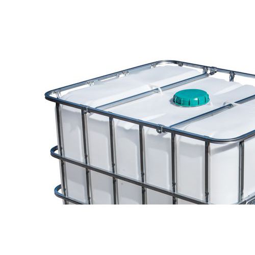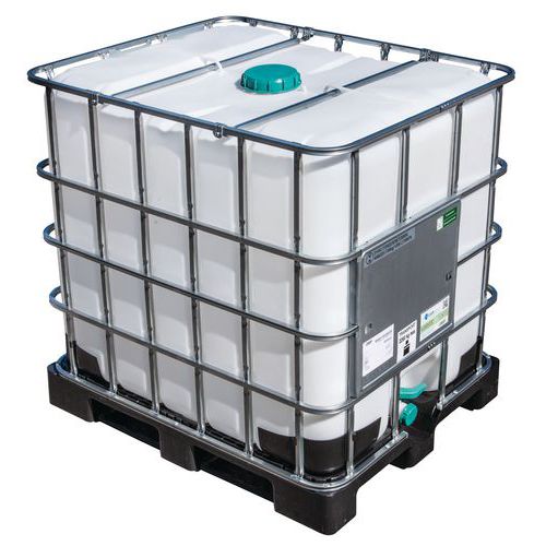 | Tavaranimike | IBC-säiliö, jossa muovilava ja teräshäkki, 1000 L, Tilavuus: 1000 L, Kokonaiskorkeus: 1168 mm |