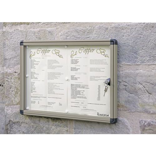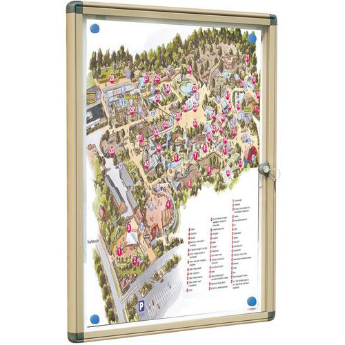 - Ilmoitustaulukaappi ulkokäyttöön, magneettinen pohjalevy. Kehys alumiinia, kulmat polykarbonaattia. Ovessa pleksilasi. Toimitukseen sisältyy 2 avainta.