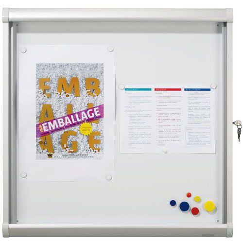 Korkki- tai magneettinen valkotaulupohja (emali). Kehys luonnonanodisoitua alumiinia. 4 mm turvalasi. Valitaan asennettaessa: oikea- tai vasenkätisyys (sis. asennusruuvit). Avainlukko.