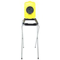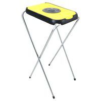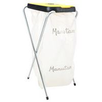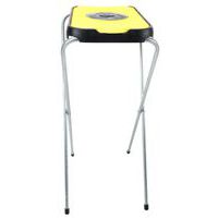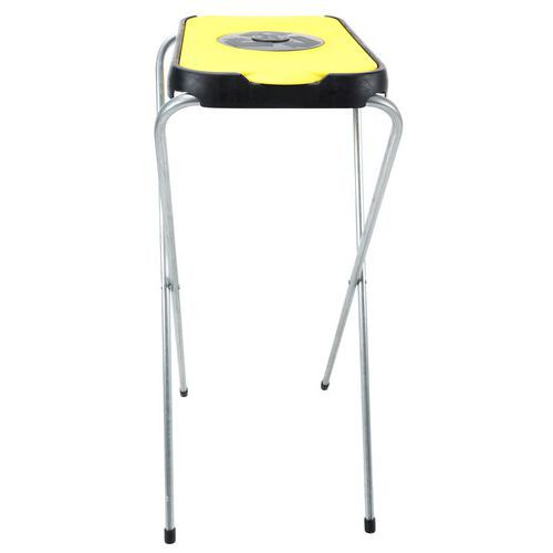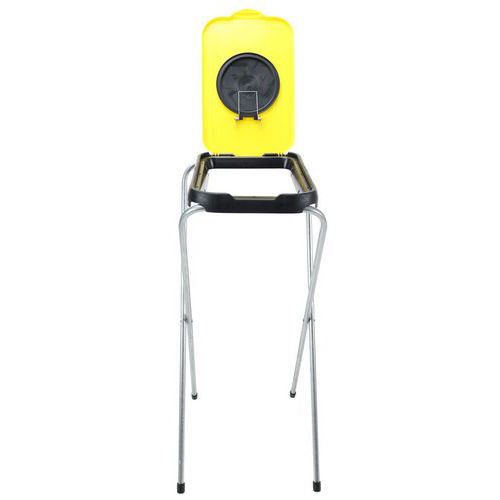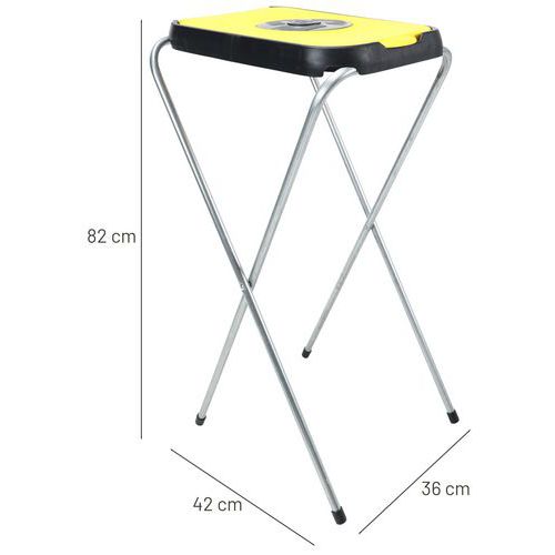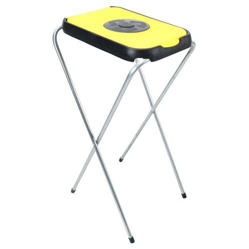 Yksinkertainen, kokoon taitettava jätesäkkiteline, jossa on galvanoitu putkirunko ja värillinen muovikansi.