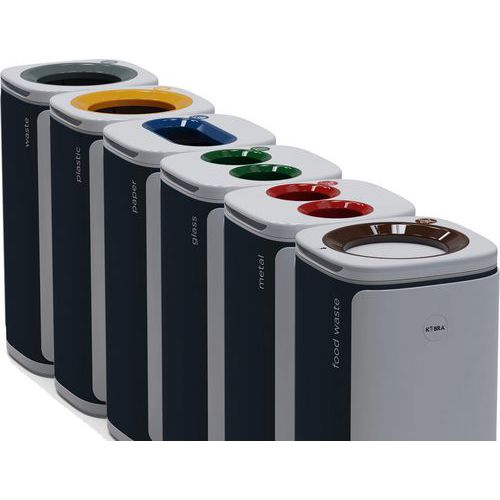 Värikoodatut kannet ja merkinnät etupuolella tekevät jätteiden lajittelusta helppoa.