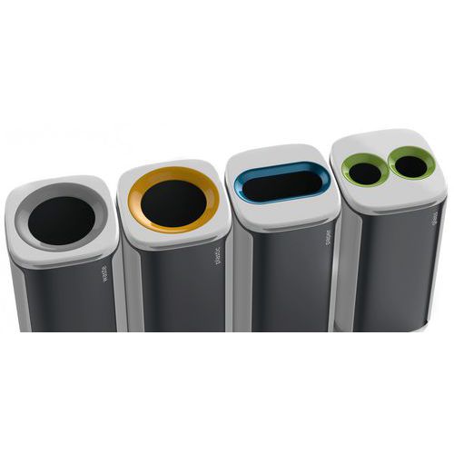 Värikoodatut kannet ja merkinnät etupuolella tekevät jätteiden lajittelusta helppoa.