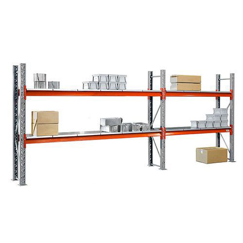 Hyllyt koostuvat vain kahdenlaisista osista, päädyistä ja kannatinpalkeista. Jos täydennät hyllyä hyllytasoja, voit varastoida laatikoita, kartonkeja ja muita irrallisia tavaroita. Voidaan käyttää myös normaalien lavojen ja pienlavojen varastointiin. Lavat voidaan sijoittaa myös suoraan hyllytasoille. Malli on EAB-standardin mukainen, galvanoidut päädyt ja tuet, oranssit kantopalkit.
