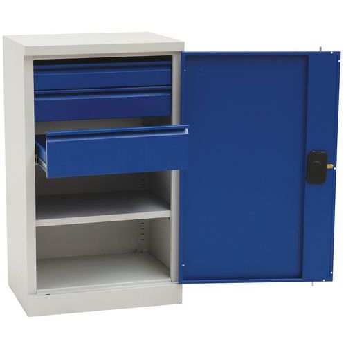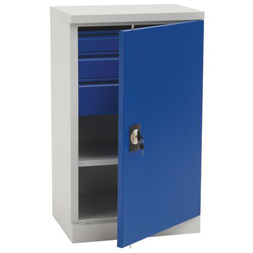 Vankka ja matala työpajakaappi raskaiden materiaalien ja työkalujen säilytykseen.