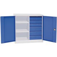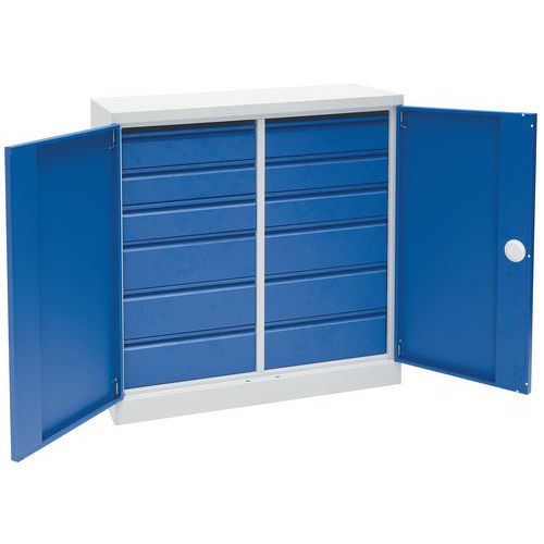 Vankka ja matala työpajakaappi raskaiden materiaalien ja työkalujen säilytykseen.