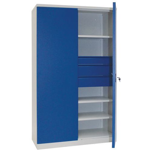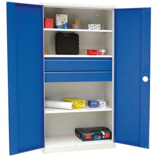 Vankka ja korkea työpajakaappi raskaiden materiaalien ja työkalujen säilytykseen. Korkeussuunnassa helposti säädettävät laatikot, liukukiskot ja 20 mm:n välein säädettävät hyllyt. Laatikot on helppo avata ja sulkea kuulalaakerikiskojen ansiosta. Kaappi on helppo kiinnittää seinään, jolloin se on vakaampi.