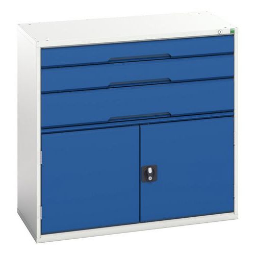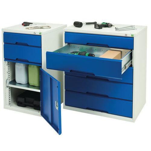 Yhdistelmäkaappi hitsatusta teräslevystä vahvikkeilla teollisuuskäyttöön. Laatikot on asennettu rullakiskoihin, jotka kestävät 60 kg:n kuormituksen. Helppo avata ja sulkea, myös täydessä kuormassa. Laatikostoissa on keskuslukitus. Syvyys 550 mm. Turvallisuusohjeet: - asenna huonekalu tasaiselle alustalle - kiinnitä se seinään tai väliseinään sopivilla kiinnikkeillä - varo ylittämästä suositeltua enimmäiskuormaa ja varmista, että kuorma jakautuu tasaisesti.
