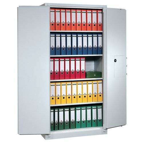 Palonkestävä ja murtosuojattu arkistokaappi. Sopii kansioiden säilytykseen. Hyllyjen korkeutta on helppo säätää. Sulje kaappi tukevasti kaksoisbittisellä avainlukolla. Tilaa erikseen ripustettava kansiojärjestelmä asiakirjojen säilyttämistä varten.