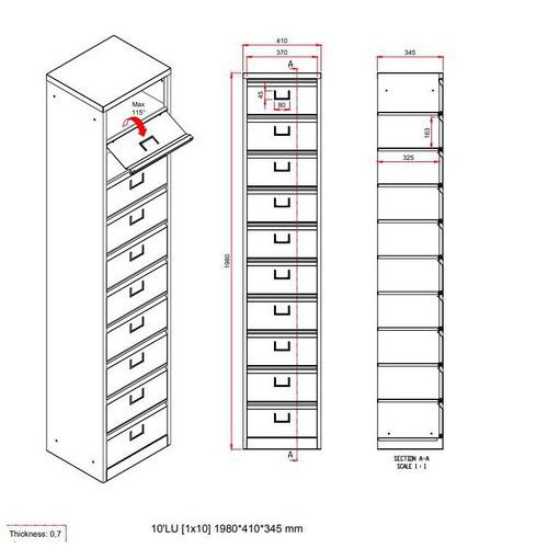 | Tavaranimike | Kansiokaappi jossa 10 lokeroa, Kokonaiskorkeus: 198 cm, Kokonaisleveys: 41 cm, Kokonaissyvyys: 34.5 cm, Lkm |