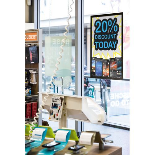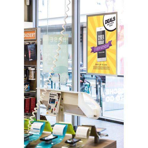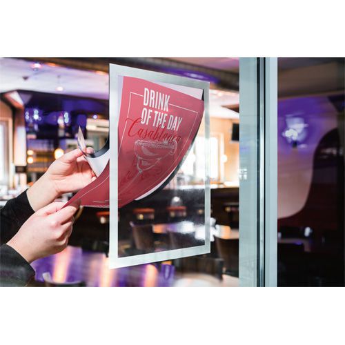 Duraframe Sun on kehys, joka kiinnittyy staattisesti ilman liimaa ja muodostamatta kuplia. Se on lämmönkestävä ja UV-suojattu, joten se on ihanteellinen myymälän ikkunassa. Voidaan poistaa jälkiä jättämättä ja käyttää uudelleen. Kiinnittämiseen tarvitset vain sumutepullollisen vettä ja ripauksen astianpesuainetta (600 ml vettä + 1 rkl astianpesuainetta), kaavin sisältyy toimitukseen. Sisältö voidaan vaihtaa nopeasti ja helposti magneettisen aukaisumekanismin ansiosta. Kehys on identtinen molemmilta puolilta ja sitä voidaan käyttää sekä pysty- että vaakatasossa.