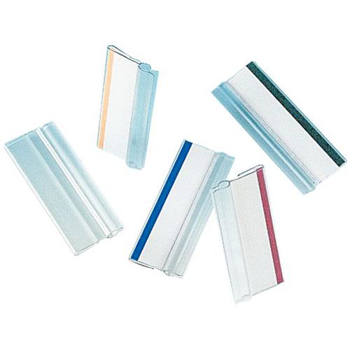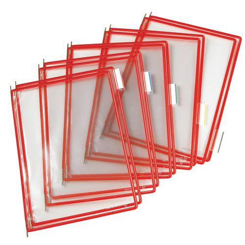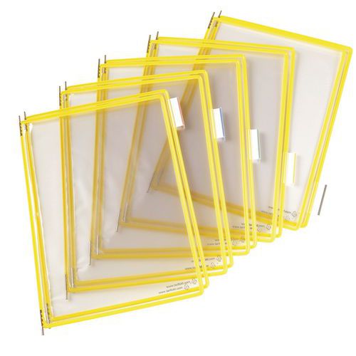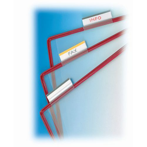 Tukeva teräslankakehys. Aukko taskun yläreunassa. Mukana 5 otsakepidintä (50 mm) sekä värillisiä ja valkoisia liuskoja 10 muovitaskulle. Tarvikkeita Pöytäteline Tarifold.