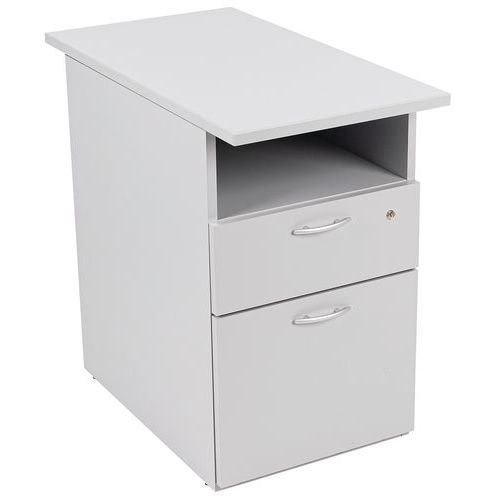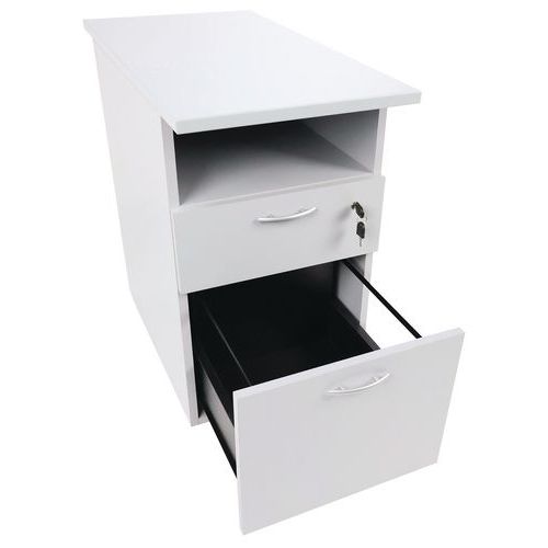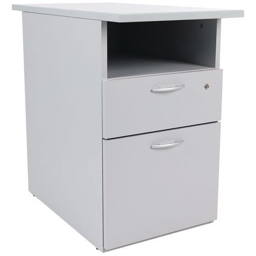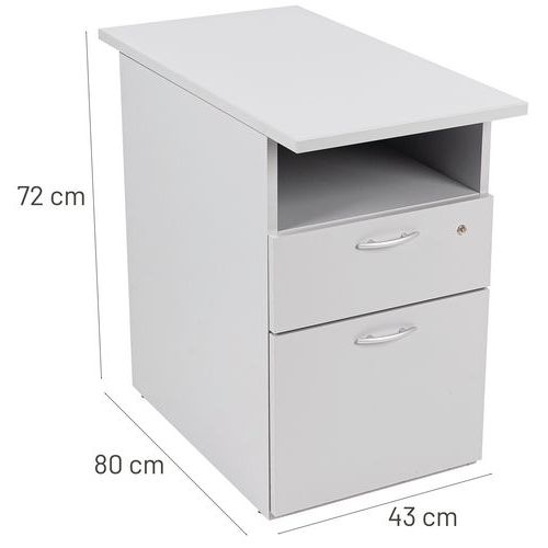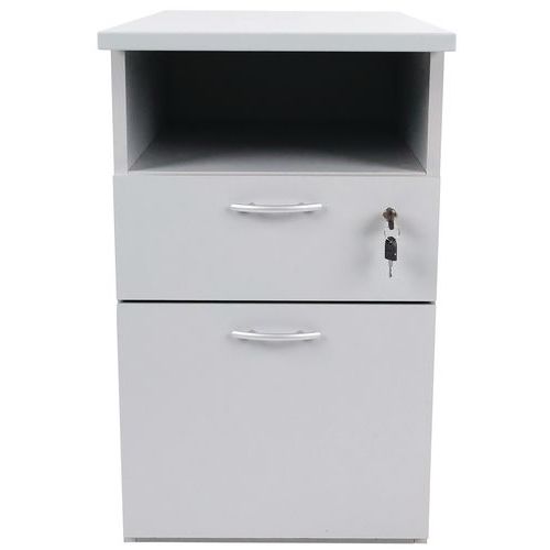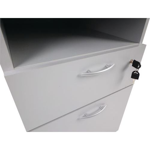 Pöydän korkuinen arkistokaappi alumiinikahvoilla. Yksi lukollinen laatikko. Lisää säilytystilaa kaapin yläosan alla. Pidä asiakirjat aina käsillä