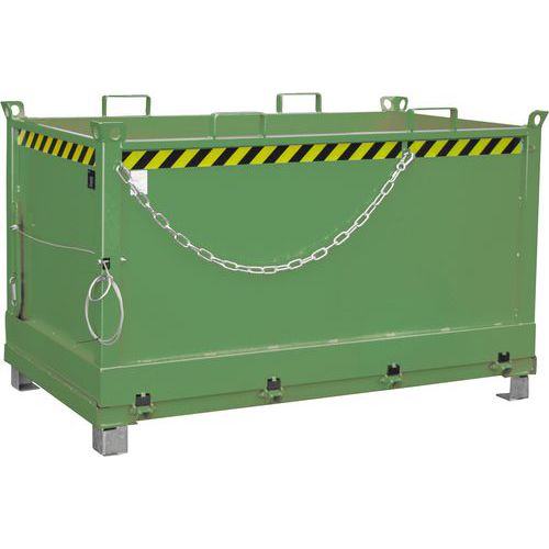 Pohjasta aukeava kippisäiliö - Ihanteellinen säilytykseen ja kuljetukseen.Voidaan nostaa trukilla tai nosturilla.Vedä lukitusvaijerista ja pohja aukeaa.Vankka teräsrakenne. Turvaketju vakiona - estää säiliön tippumisen kuljetuksen aikana, esim. äkkipysähdyksessä.Säiliö lukkiutuu automaattisesti laskeutuessaan tyhjennyksen jälkeen.Saatavilla 500 / 750 / 1000 / 1500 / 2000 L vetoisuudet.Voidaan pinota maks. 3 päällekkäin.4 nostosilmukkaa (40 mm)Lisävarusteet:1) Sivuseinät pohjalevyn päädyissä (helpottavat hallittua tyhjennystä).2) Sinkitty kaksiosainen kansi.3) Pyöräsarja (Kaksi liikkuvaa ja kaksi kiinteää polyamidipyörää. Yhdessä pyörässä jarru) Maks kuormitus (kg) : 1500 kg
