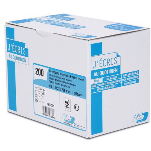 90g valkoinen kirjekuori, jossa pika-avattava ikkuna. Turvallinen sulkeminen vahvistetulla liimauksella. Saranoitu annostelija ja uudelleenkäytettävä laatikko. Paperi kestävästi hoidetuista metsistä. Mattakalvoikkuna.