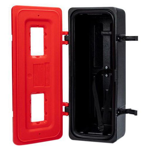 Kotelo yhdelle sammuttimelle, Materiaali: Korkeatiheyksinen polyeteeni, Väri: Punainen/musta Kotelo yhdelle sammuttimelle, Materiaali: Korkeatiheyksinen polyeteeni, Väri: Punainen/musta
