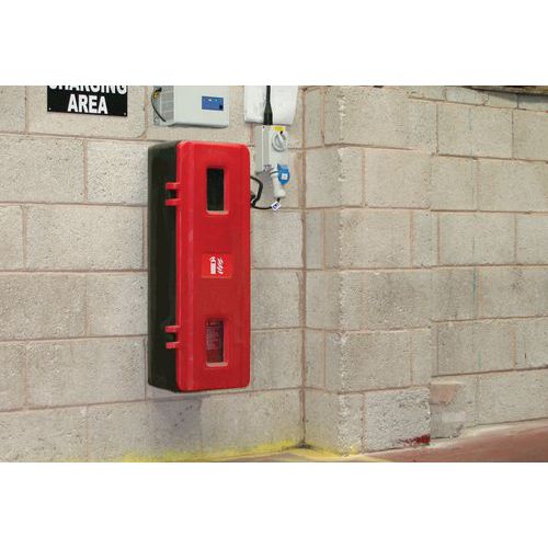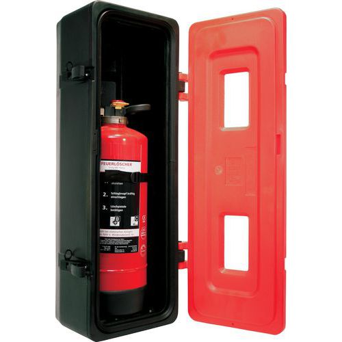 Kotelo yhdelle sammuttimelle, Materiaali: Korkeatiheyksinen polyeteeni, Väri: Punainen/musta Kotelo yhdelle sammuttimelle, Materiaali: Korkeatiheyksinen polyeteeni, Väri: Punainen/musta