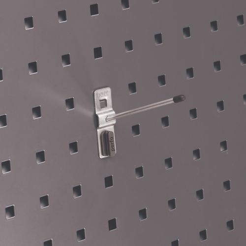 Kalteva paneeli työkalujen ripustukseen. Muoviset päätytulpat parantavat turvallisuutta. Vankka malli, jonka paksuus on 6 mm. Muovinen turvaklipsi helpottaa tuen kiinnittämistä.