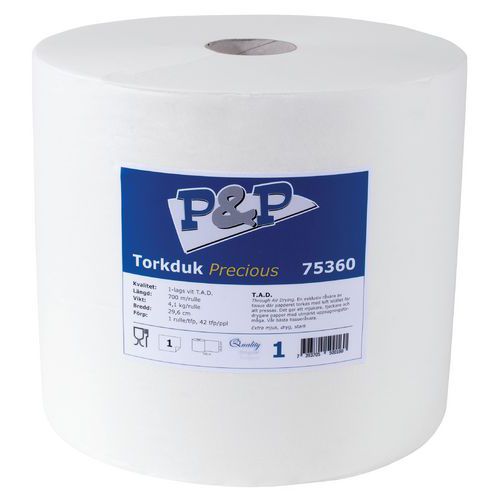 | Tavaranimike | Pyyheliina Precious, Väri: Valkoinen, Muoto, leveys: 30 cm, Pituus: 575 m, Halkaisija: 32 cm, Kerrokset: 1 |