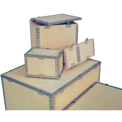 - Puinen kuljetuslaatikko, jonka kulmasuojat ovat galvanoitua terästä.
