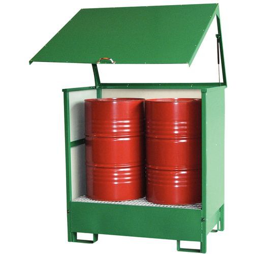- Monikäyttöinen ratkaisu, joka mahdollistaa turvallisen neljän tynnyrin (220 l) tai yhden IBC-säiliön (1000 l) varastoinnin.