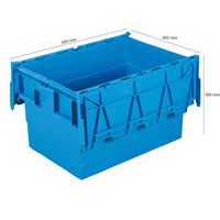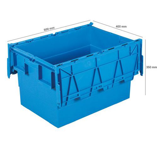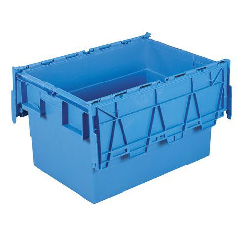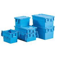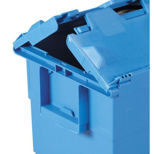 Polypropeenista valmistetut kuljetuslaatikot, joissa on sileä pohja ja reunat sekä integroitu kansi, jossa on mahdollisuus hihnakiinnitykseen ja sinetöintiin.