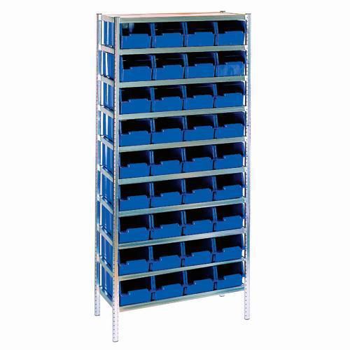 - Täydellinen hyllykkö, jossa on 10 hyllyä ja 36 sinistä muovilaatikkoa 12,5 l (161 x 210 x 465 mm). Varastolaatikoissa on kätevät kädensijat edessä ja takana, ja reunojen ansiosta laatikot pysyvät hyvin paikoillaan keräilyn aikana.
