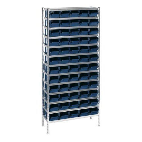 - Täydellinen hyllykkö, jossa on 13 hyllyä ja 60 sinistä muovilaatikkoa 5 l (111 x 168 x 375 mm). Reunojen ansiosta laatikot pysyvät hyvin paikoillaan keräilyn aikana.