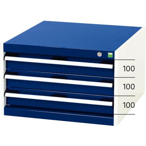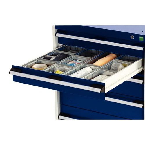 Laatikoiden korkeussäädettävät 25 mm:n välein. Laatikot avautuvat 100 %: täysi pääsy sisältöön. Keskuslukitus avaimella. Laatikoiden varassa on kuulalaakerointi. Tehty UK