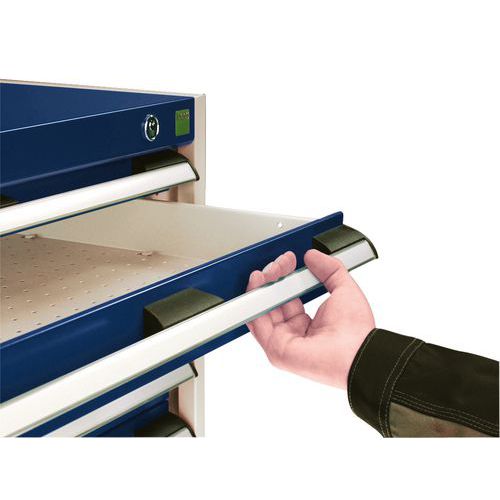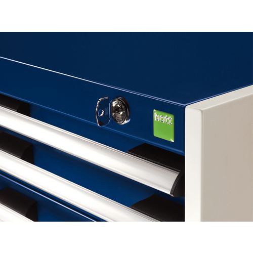 Laatikoiden korkeussäädettävät 25 mm:n välein. Laatikot avautuvat 100 %: täysi pääsy sisältöön. Keskuslukitus avaimella. Laatikoiden varassa on kuulalaakerointi.