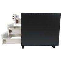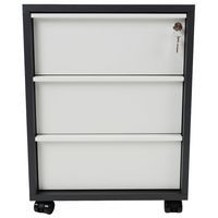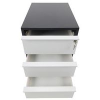 Käytännöllinen klassinen toimistolaatikosto, jossa on kolme laatikkoa.  Lukittava, joten sinulla on aina tavarasi turvallisessa säilytystilassa.  Maksimikuormitus laatikkoa kohti 25 kg.  37 mm kääntyvät pyörät.   Suurin kuorma per laatikko: 25 kg.  Kääntyvät pyörät, joiden halkaisija on 37 mm.