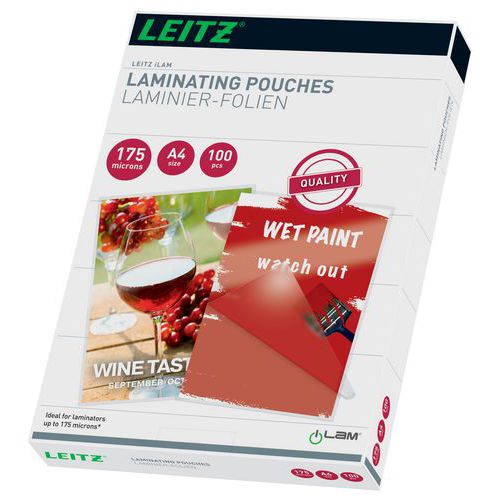 Laminaatti matalalämpö A4 kiiltävä, 100/pakkaus – Leitz, Paksuus: 175 µm, Muoto: 210 x 297 mm (A4)