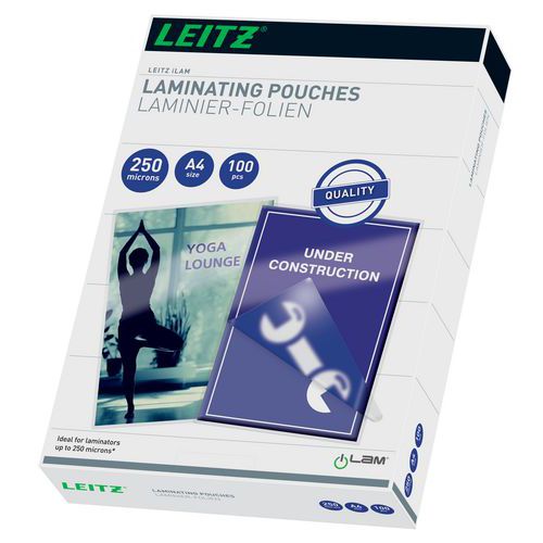 Laminaatti matalalämpö A4 kiiltävä, 100/pakkaus – Leitz, Paksuus: 250 µm, Muoto: 210 x 297 mm (A4)