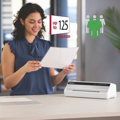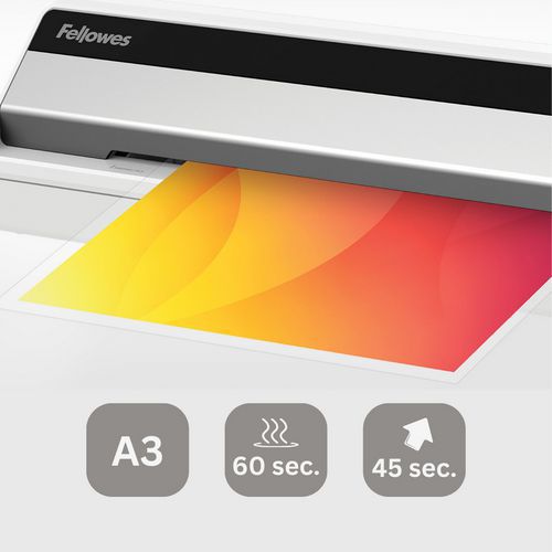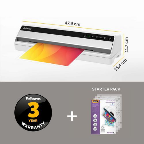 Erittäin nopea, 60 sekunnin lämpenemisaika InstaHeat-teknologian ansiosta. Laminointilaite, jossa on 4 lämpötila-asetusta: kylmä, 80, 100 ja 125 mikronia. Siirtyy automaattisesti valmiustilaan oltuaan käyttämättömänä 30 minuuttia turvallisuuden varmistamiseksi. Helppokäyttöinen: tukkeutumisenestovipu ja kosketusnäyttö. Toimitetaan 3 vuoden valmistajan takuun kanssa (rekisteröinnistä riippuen).